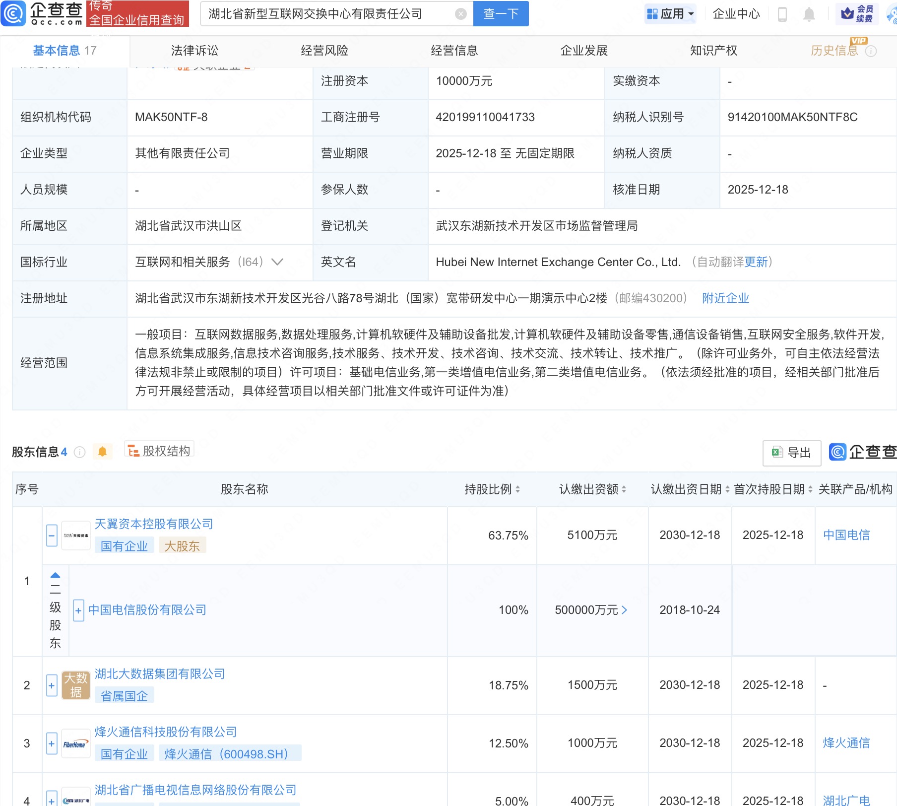 近日股票配资专业知识,湖北省新型互联网交换中心有限责任公司成立,注册资本1亿元,经营范围包含:互联网数据服务;数据处理服务;计算机软硬件及辅助设备批发;计算机软硬件及辅助设备零售等。企查查股权穿透显示,该公司由中国电信(601728)全资子公司天翼资本控股有限公司、湖北大数据集团有限公司、烽火通信(600498)、湖北广电(000665)共同持股。